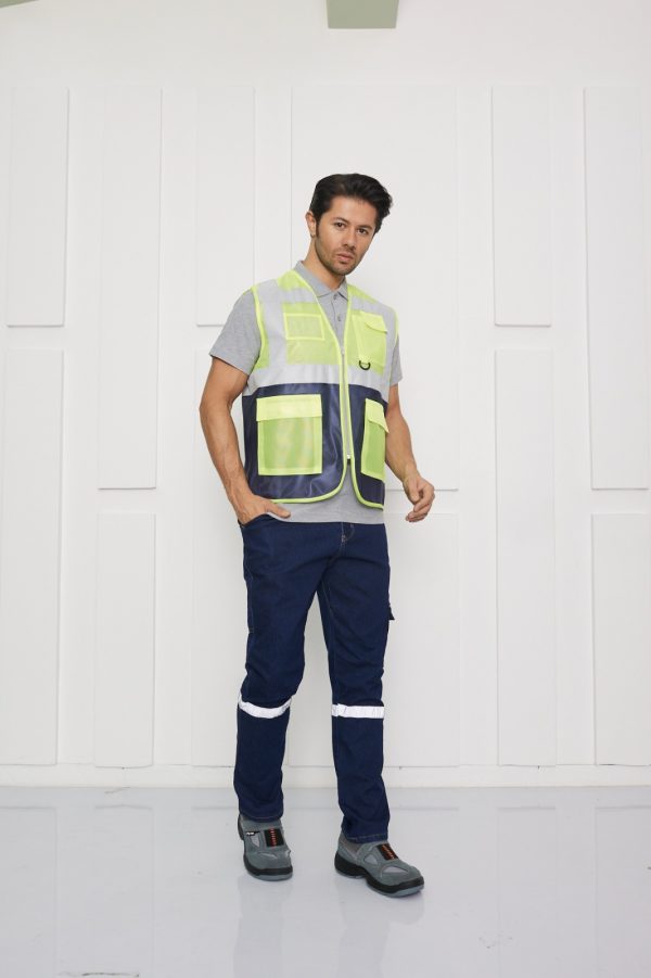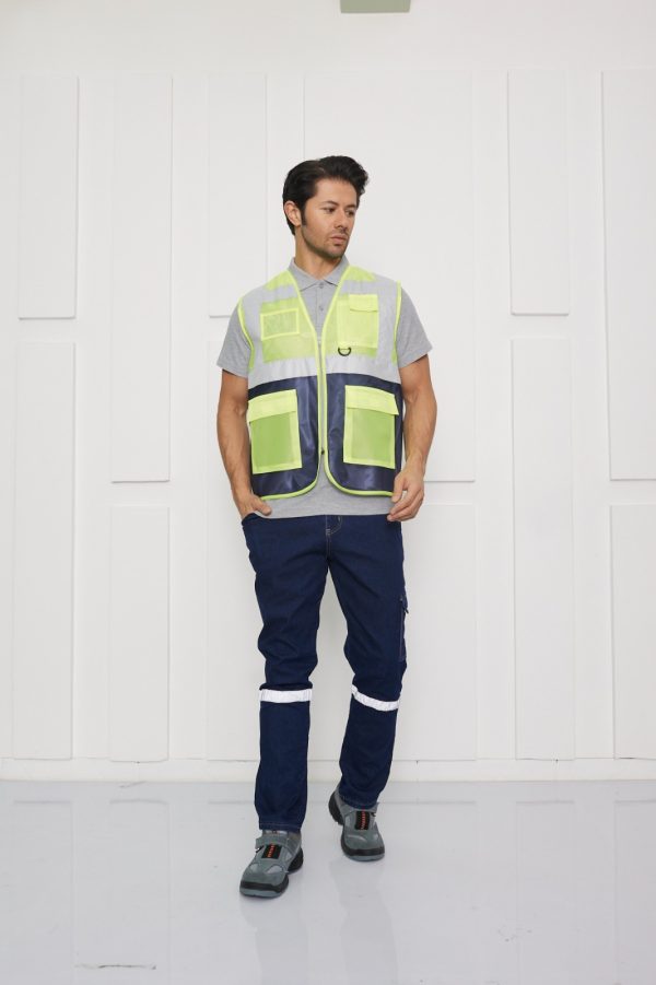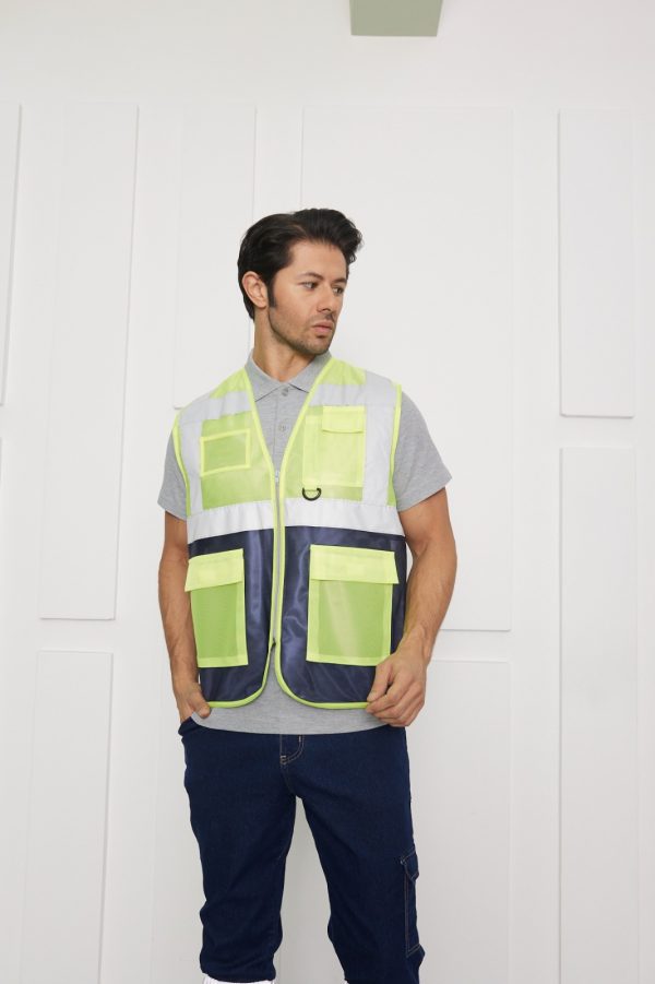Yüksek görünürlüklü floresan sarı zemin üzerine konumlandırılmış lacivert reflektör bantlarıyla maksimum fark edilirlik sağlayan bu sarı ikaz yeleği, güvenliği ön planda tutar. Reflektörlü yelek tasarımı, düşük ışıklı ortamlarda görünürlüğü artırırken, çok cepli yapısı kullanıcıya pratiklik kazandırır. Ayarlanabilir bel bantları sayesinde farklı bedenlere uyum sağlar. Cepli reflektörlü yelek ihtiyacına yönelik geliştirilen bu model, inşaat, mühendislik, saha ve şantiye çalışmalarında tercih edilen profesyonel bir iş güvenliği yeleğidir. Hem dayanıklı hem de fonksiyonel bir çözüm sunar.